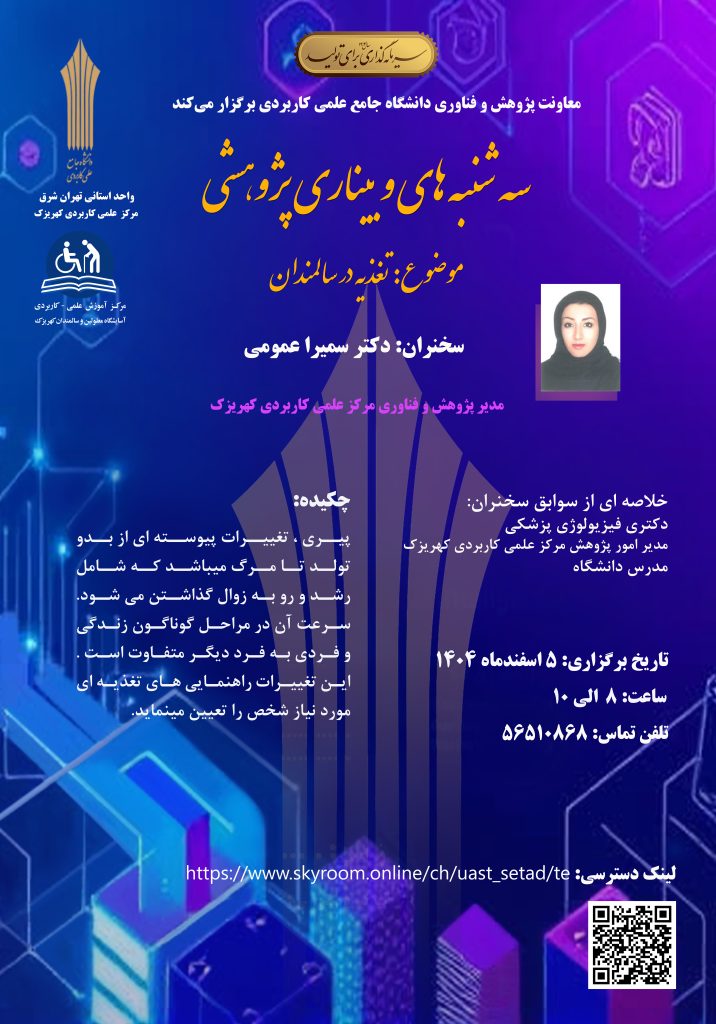 وبینار پژوهشی «تغذیه در سالمندان» در ادامه برگزاری وبینارهای هفتگی پژوهشی، روز سهشنبه ۵ اسفند ۱۴۰۴ از ساعت 8 الی